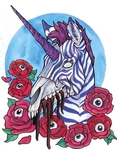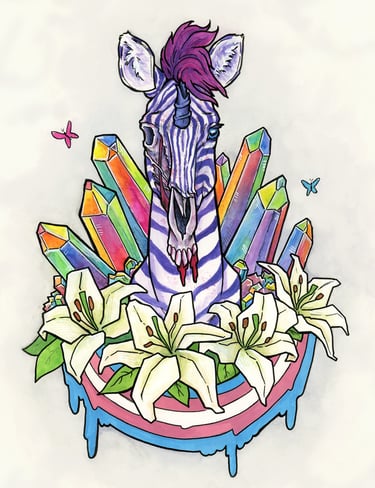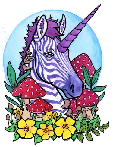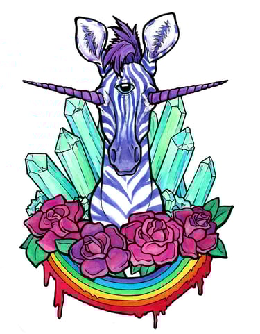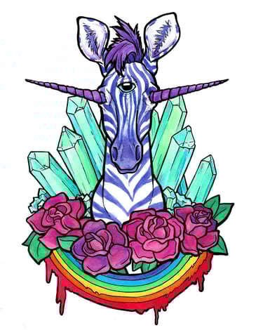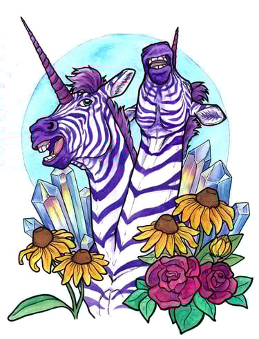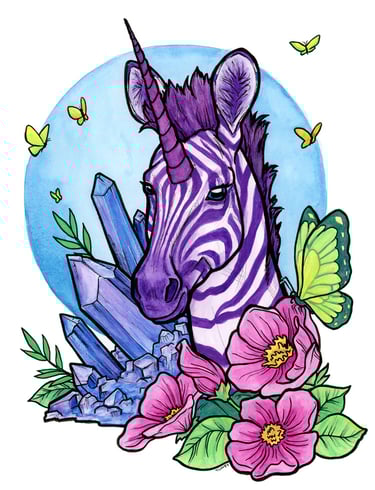 The purple Zebracorn series began as a healing celebration of the beauty and magic of being different. Early pieces featured vibrant, beautiful zebracorns surrounded by crystals and flowers. As society's perceptions of those who are different have shifted over the past years, so have the pieces. The zebracorns have become strange.