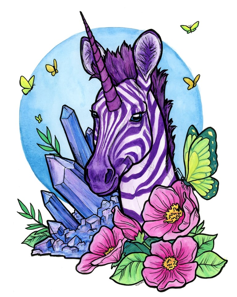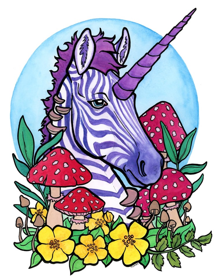 Hailing from Central Alberta, Tlouey is a dedicated artist and writer with 20 years of experience creating everything from book covers and children's illustrations to album art and band posters. Tlouey works predominantly with physical media using watercolours and Pitt artist pens. Tlouey might be best known for illustrating brightly coloured unicorns, more specifically, zebra unicorns.